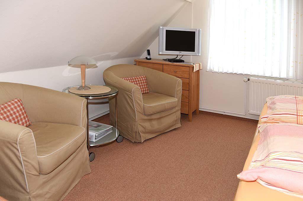 Ebenso gehören Bettwäsche und Handtücher zur Ausstattung. Eine gemütliche Sitzgruppe lädt zum Entspannen oder Fernsehen ein.